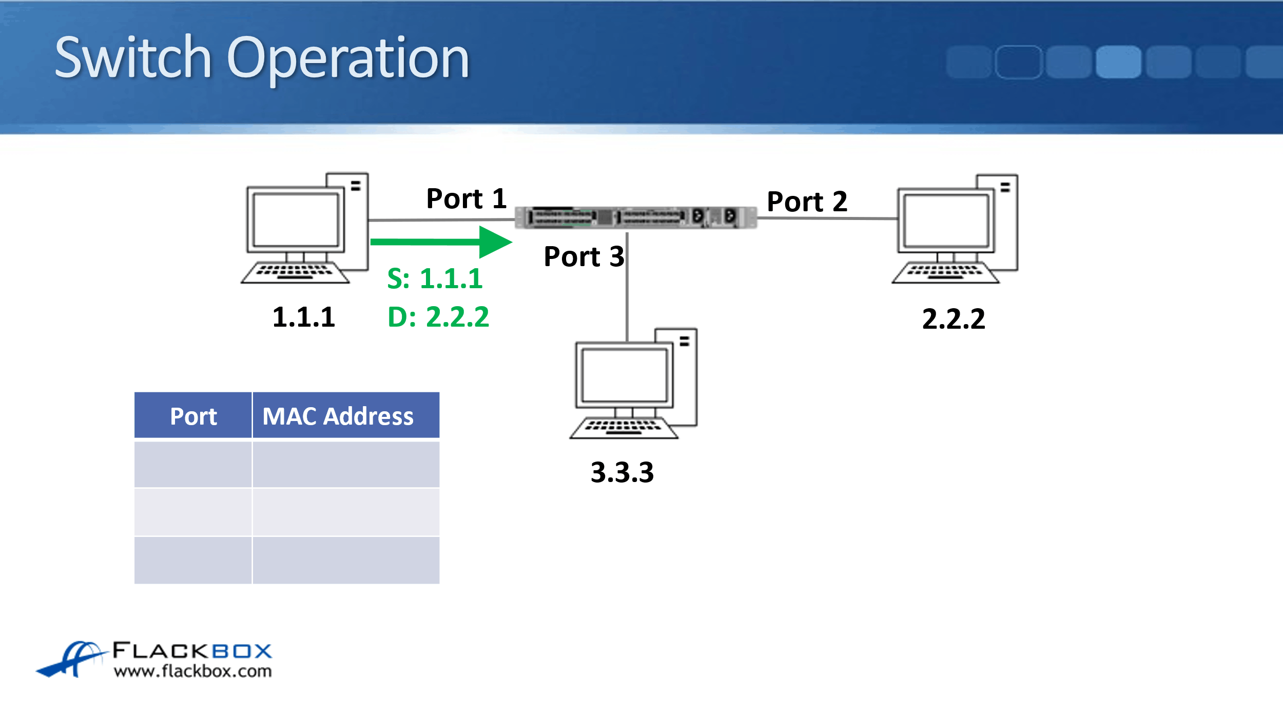 The host on the left, 1.1.1, sends a frame in with the destination MAC address of 2.2.2. The switch will see that. It sees a frame coming in with the source MAC of 1.1.1, the destination MAC of 2.2.2.