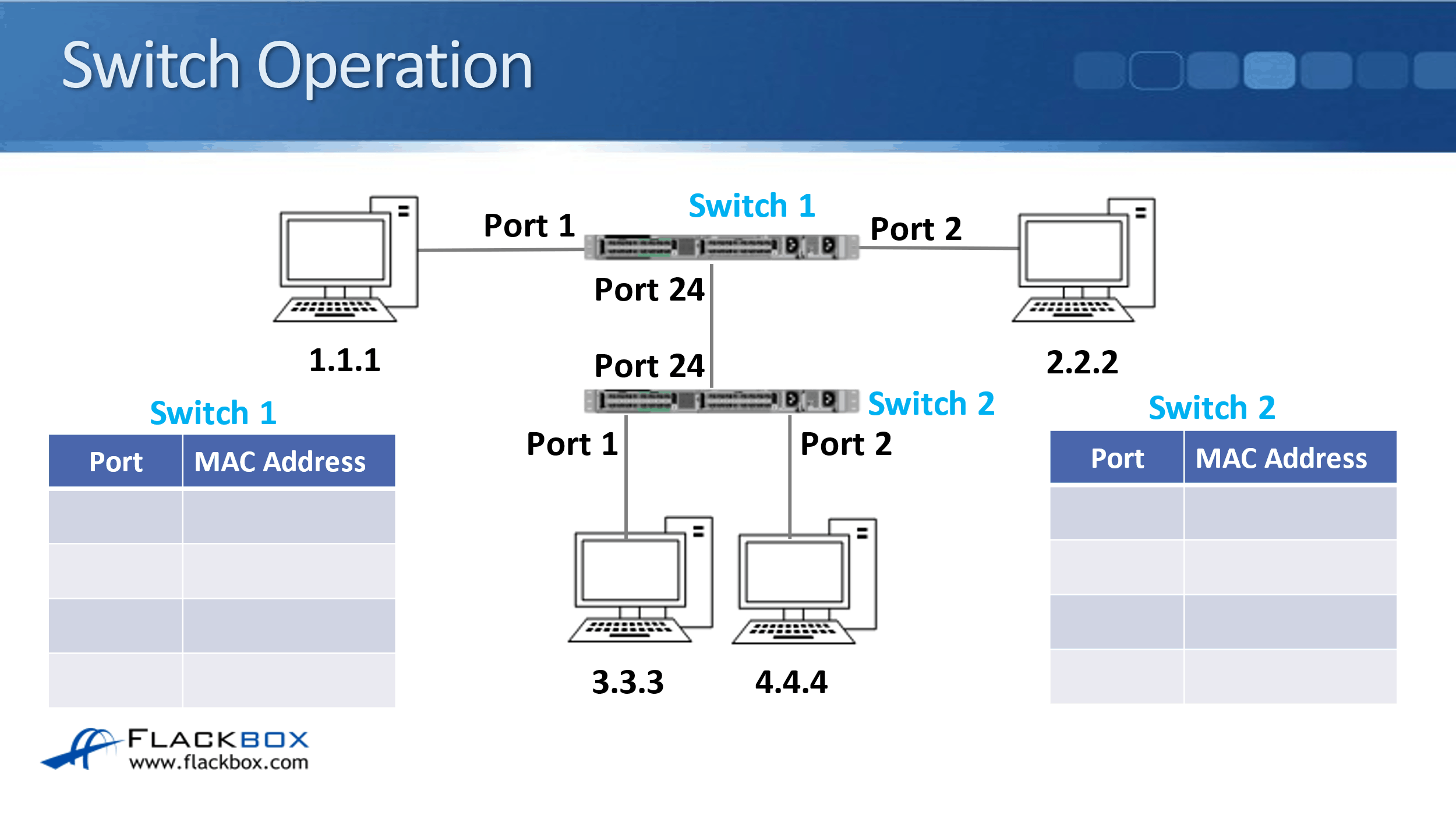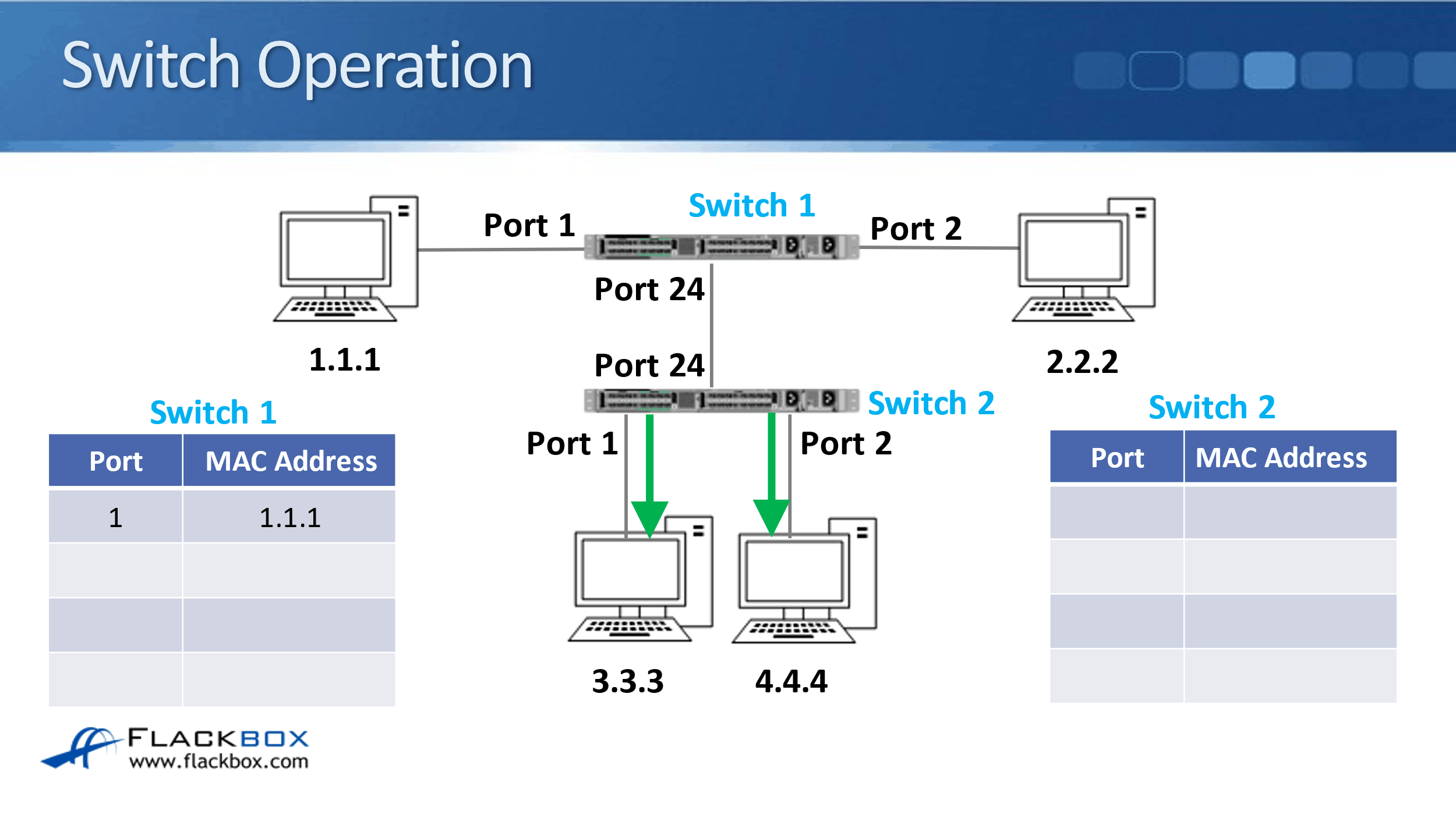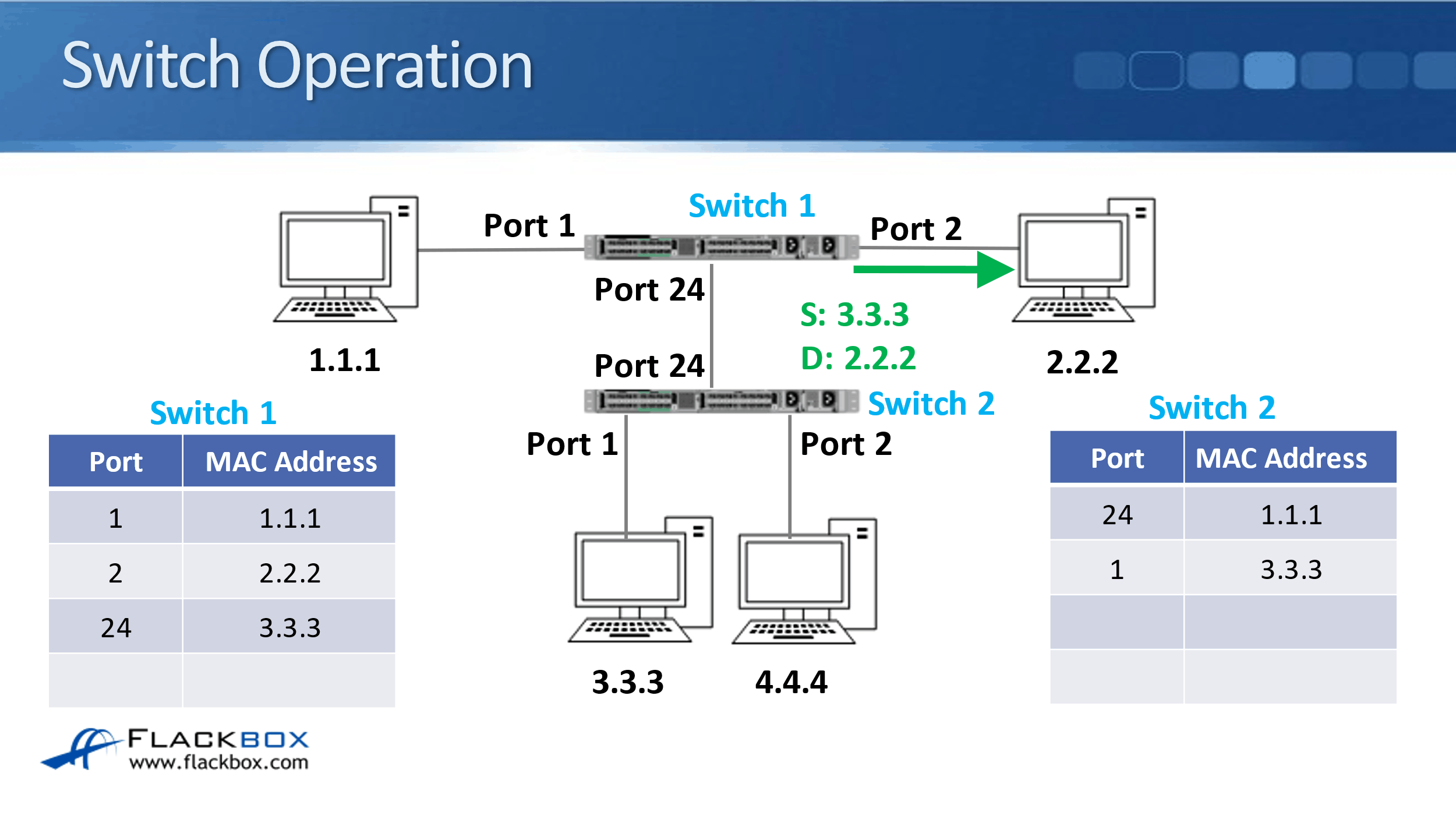 It will then forward the frame out Port 1 only because it knows that 3.3.3 is available out of that port. If you look at the MAC address table for Switch 2 now, you can see that 1.1.1 and 2.2.2 are both reachable on Port 24.