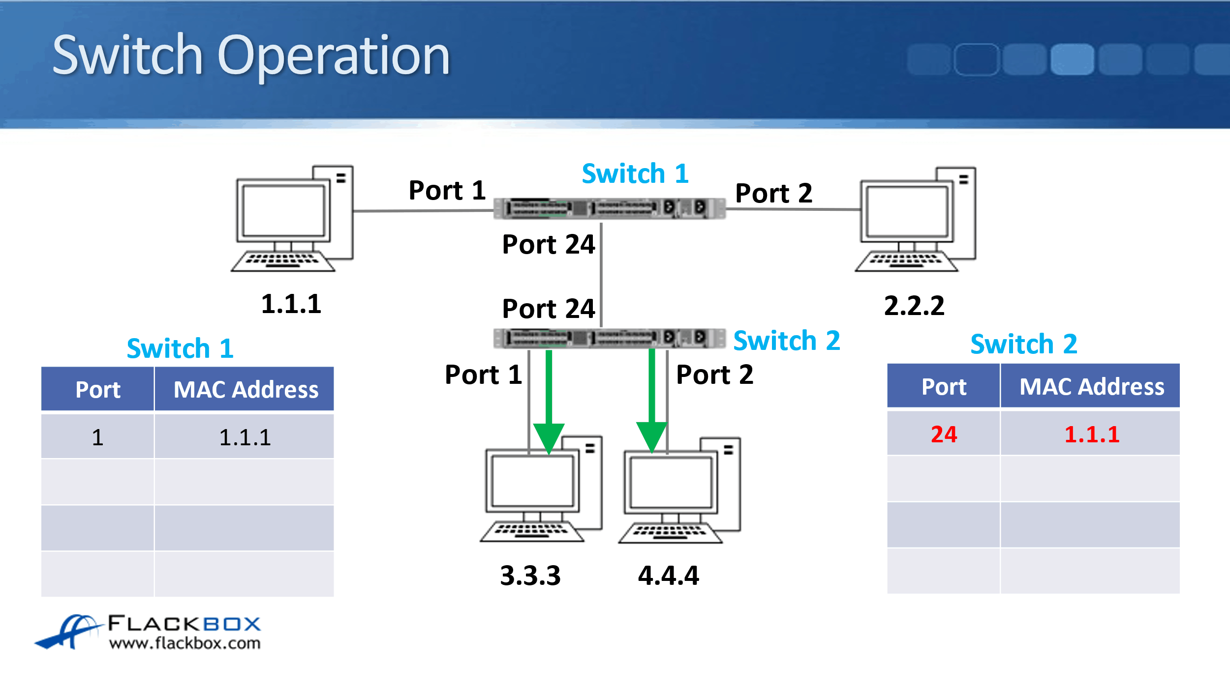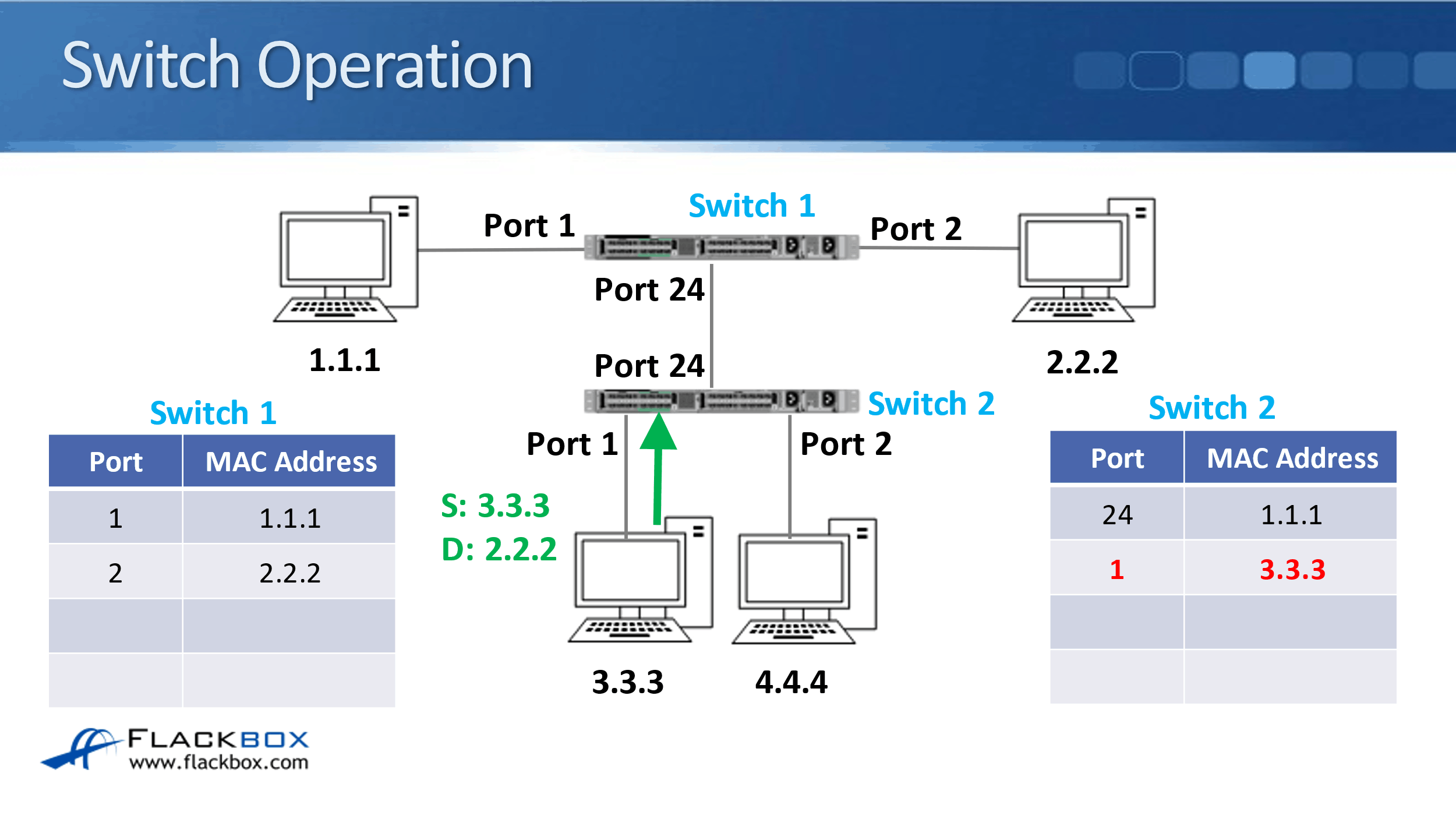 That will hit Switch 1 and Switch 1 will see the frame arriving on Port 24 that came with a source MAC address of 3.3.3. So, it will put that information in its MAC address table.