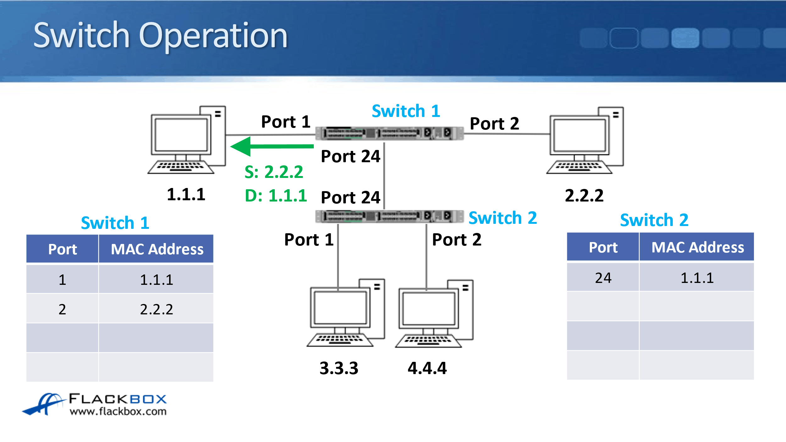 While that is happening, Switch 2 will update its MAC address table. It learned that 1.1.1 was reachable through Port 24 because that's the port that the frame came in on.