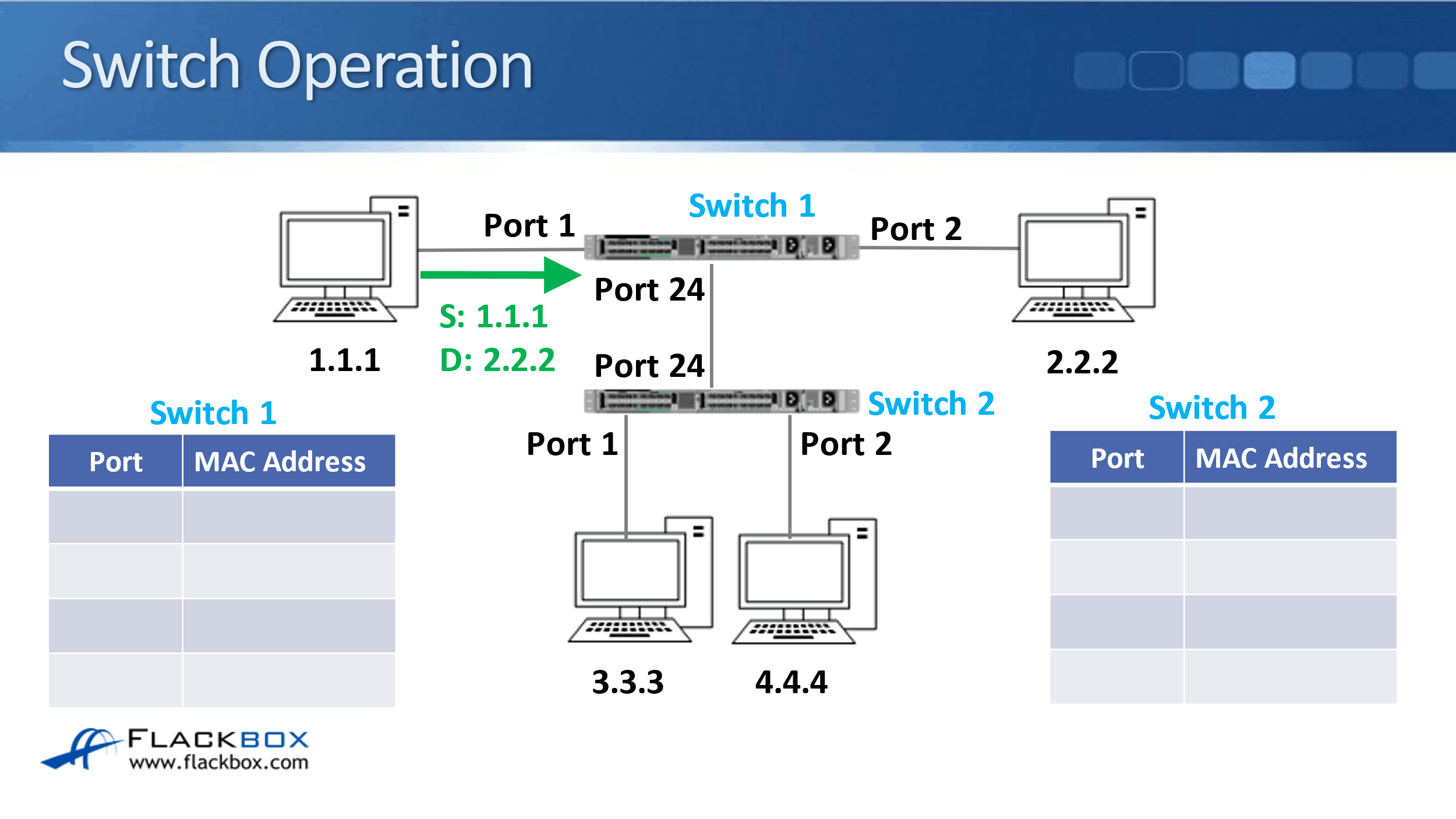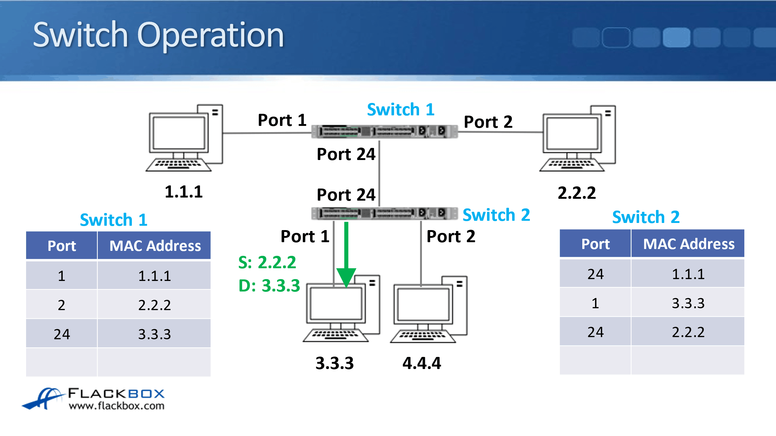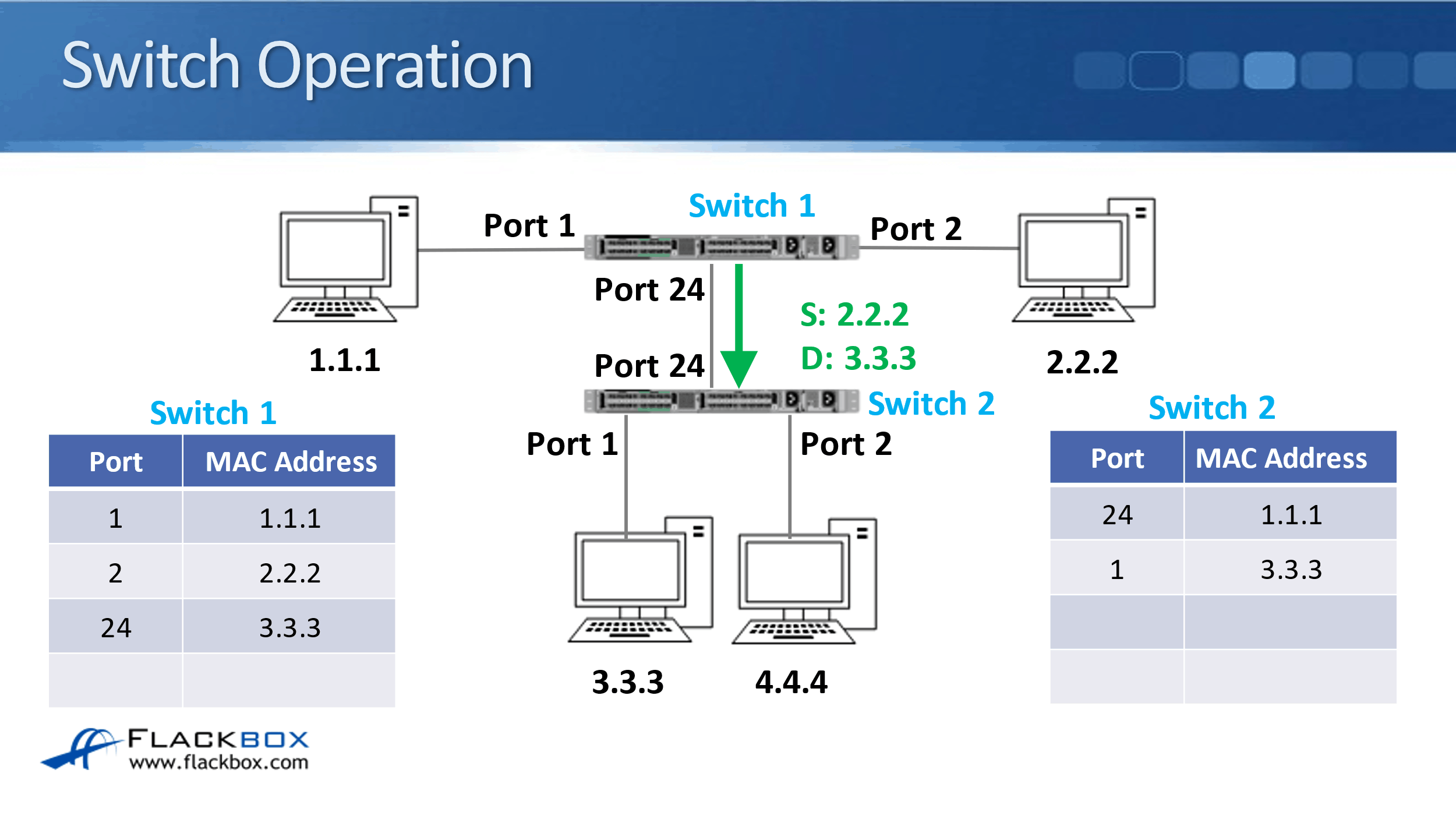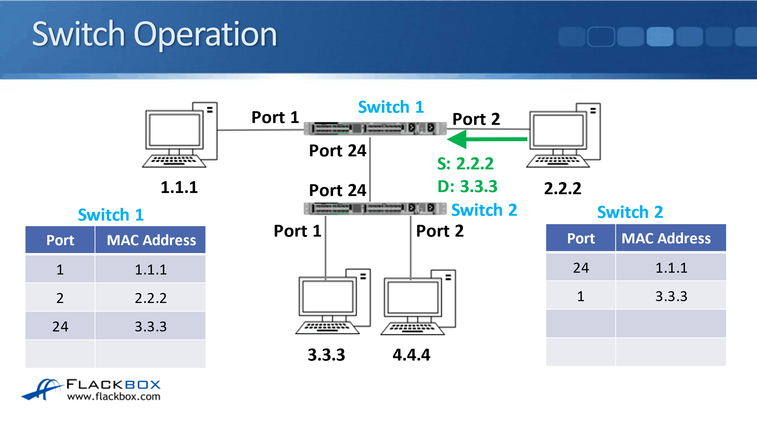 The traffic will then hit Switch 2. Switch 2 sees traffic coming in from a source MAC address of 2.2.2 on Port 24. Therefore, it will update its MAC address table with that information.