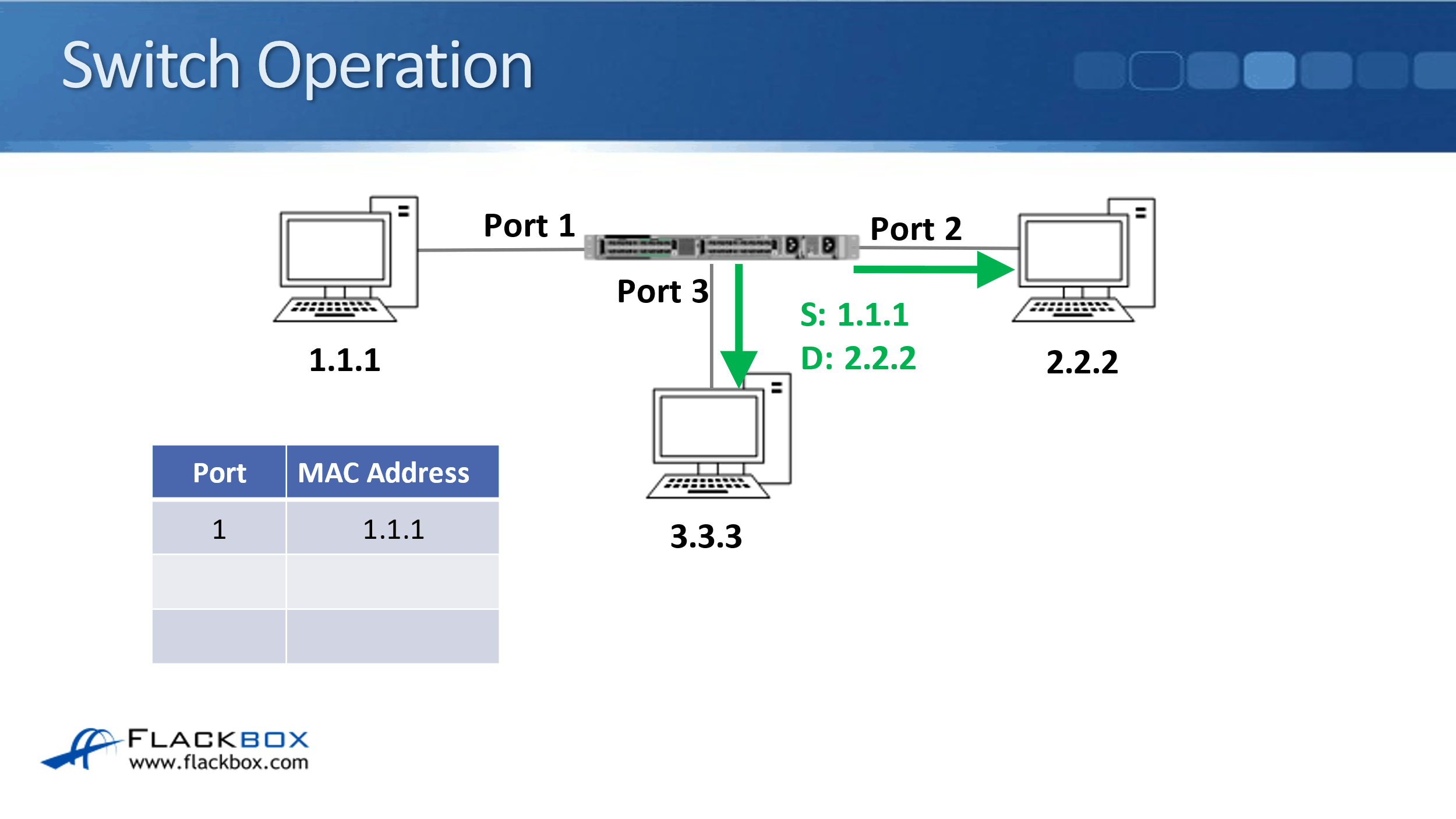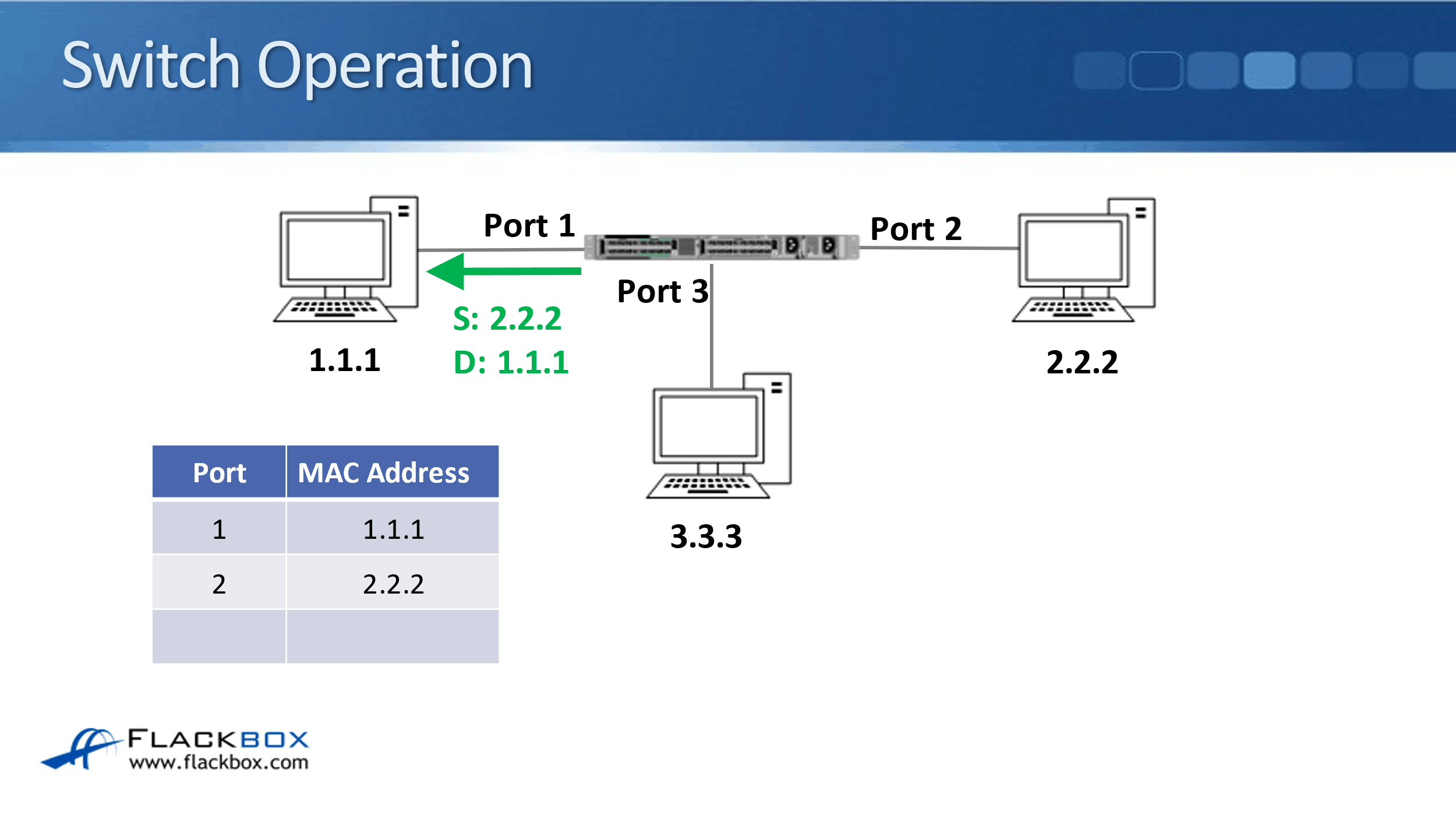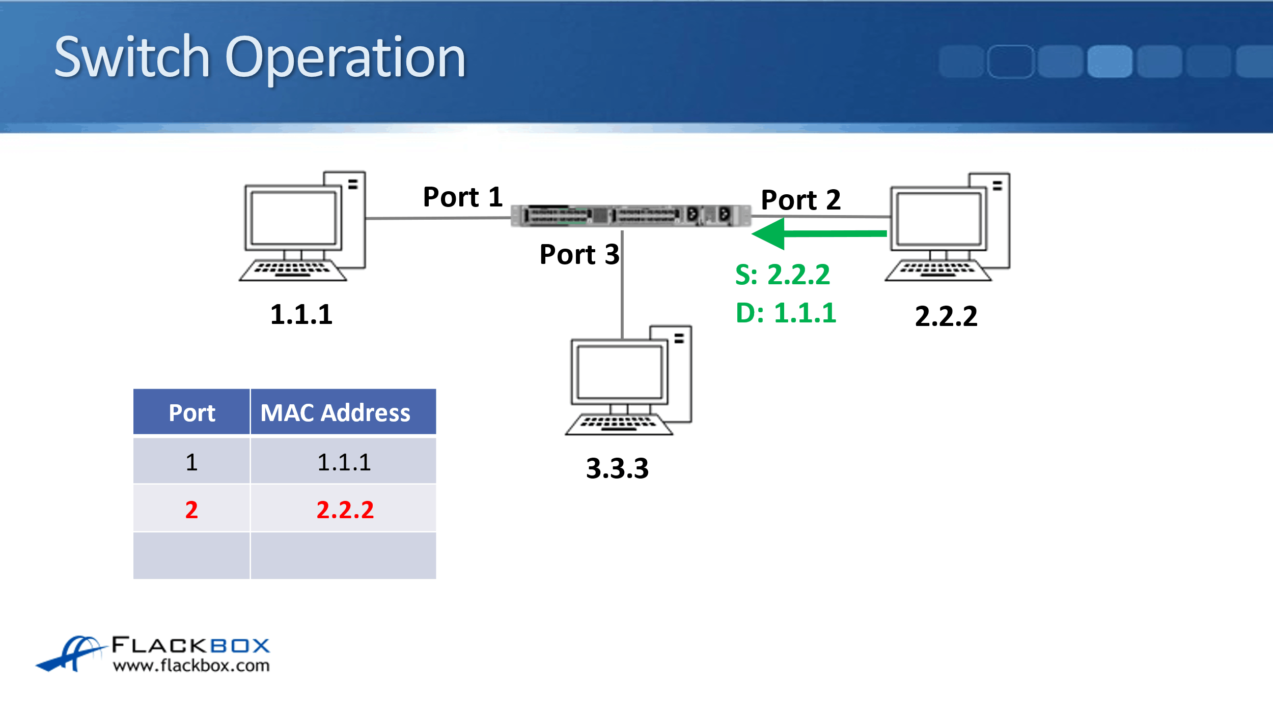 That will hit the switch again. The switch will see that traffic has come from a source of 2.2.2 and it came from Port 2. It will put that information into its MAC address table. Then, it will send the frame out only of Port 1, because it sees that the destination MAC address is 1.1.1. It knows that it's available on Port 1, so it sends it out only to that port.