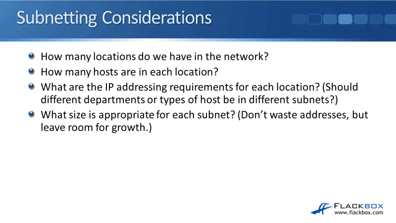 - What are the IP addressing requirements for each of the different locations? Should different departments or types of hosts be in different subnets?