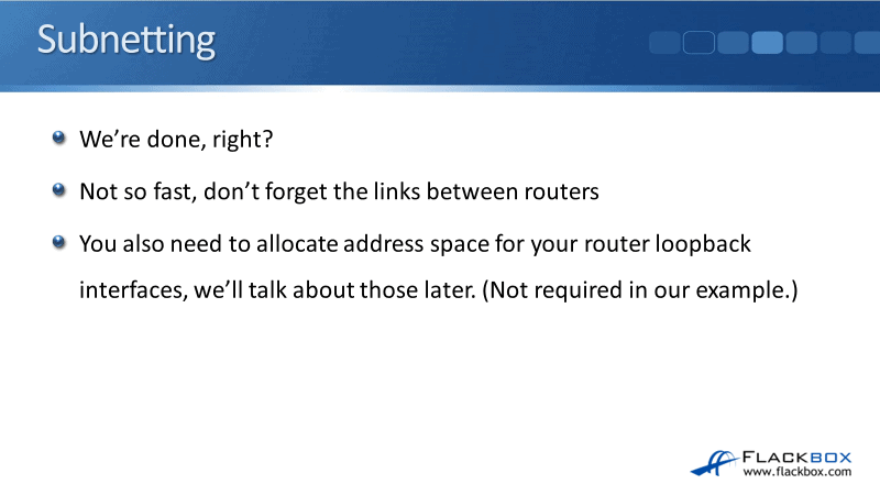 Remember, we have to allocate addresses for the point-to-point link between the routers in Boston and New York. Another thing you would do in the real world is you would also allocate address space for your loopback addresses.