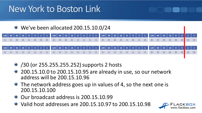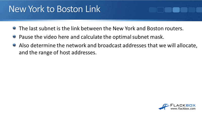 The last subnet is the link between the New York and Boston routers. We want to support 2 hosts. Remember a /31 and a /30 supports two hosts.