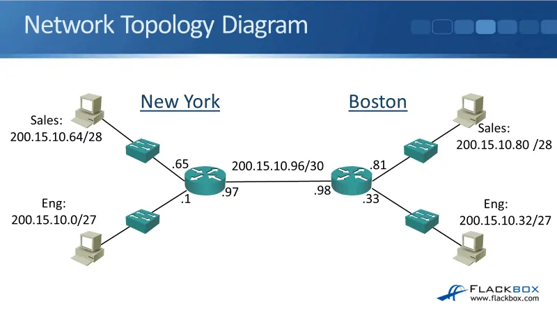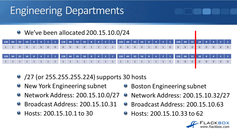 For our example, we had the Engineering departments in New York and Boston and they have got 28 hosts each, and that was the largest subnets we required.