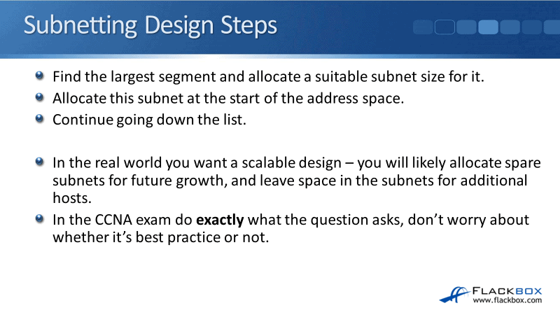 You would create that subnet at the start of our available address space and then just keep working your way down. So, you start with the largest subnet. Then move to the next one until you've allocated addresses for all of your different subnets.