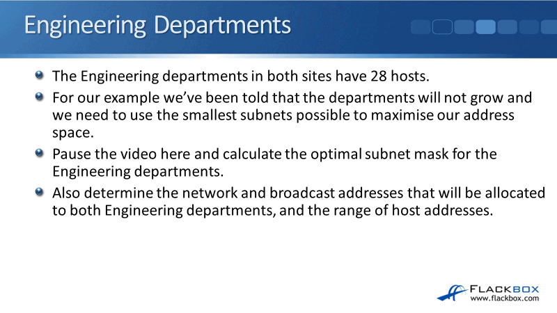 So, back to the question. We will calculate the optimal subnet mask for the Engineering departments. So no bigger than is necessary, but make sure it's at least big enough to support 28 hosts. Once you've done that, you'll be able to determine the network and broadcast addresses.