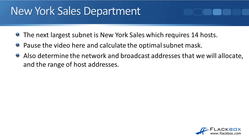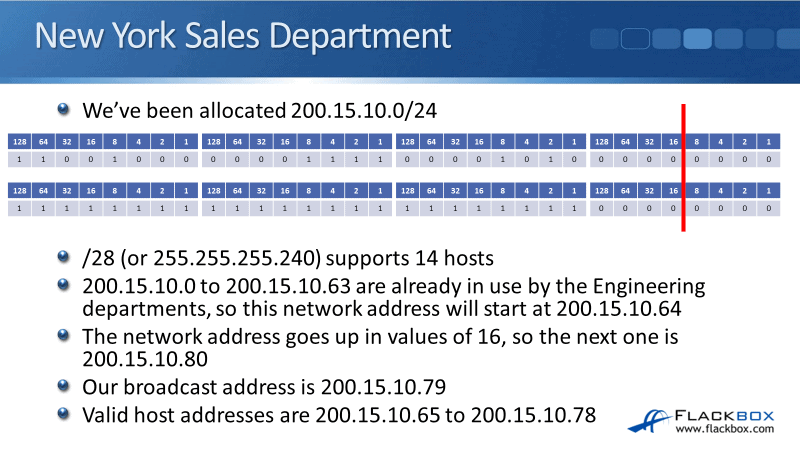 The next largest subnet is New York Sales which requires 14 hosts. The smallest possible subnet we can use is a /28. /28 means we've got 4 bits available for host addresses that gives us the 14 hosts. 200.15.10.0 to 200.15.10.63 were already being used by the Engineering departments.