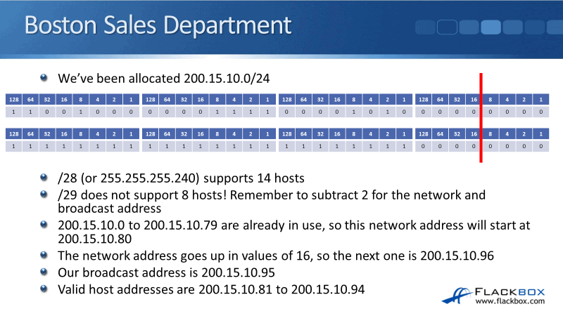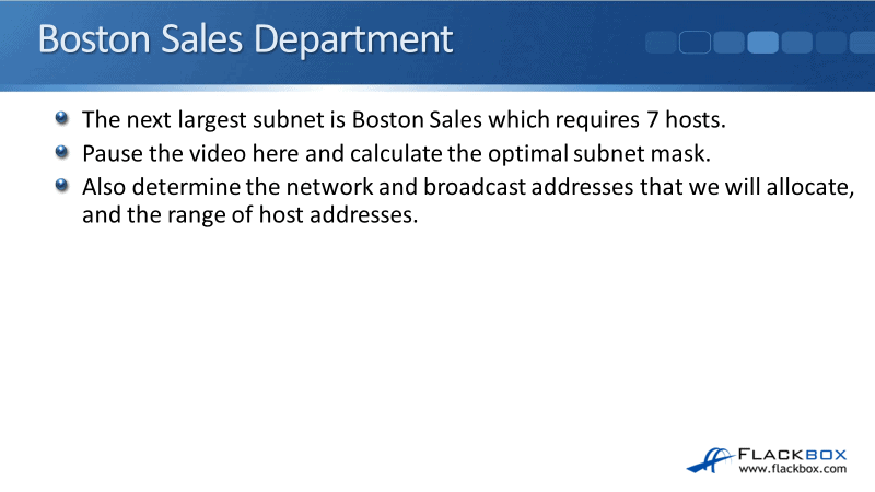 That's our first 3 departments done. The last department was Boston Sales which requires 7 hosts. We're going to use a /28 again here, same as what we did for the last department.