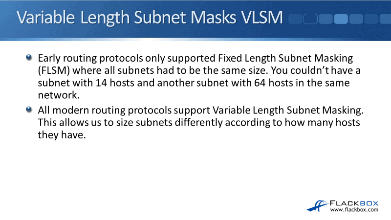 That ended up wasting a lot of addresses. So with later routing protocols, they did have support for Variable Length Subnet Masks, and now we can mix and match the size of our subnets within that greater network.
