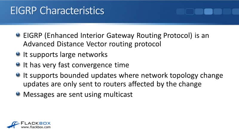 It also supports bounded updates where network topology change updates are only sent to routers affected by the change. So, it's more efficient. It doesn't flood information everywhere when it doesn't need to. Messages are sent using multicast rather than broadcast, therefore, they'll only be processed by other EIGRP routers.
