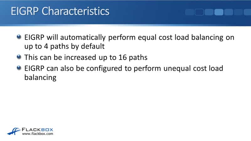 EIGRP is also the only routing protocol that can also do unequal cost load balancing. With all of the other protocols, if the multiple paths have got the same metric, they can load balance over these equal cost paths.