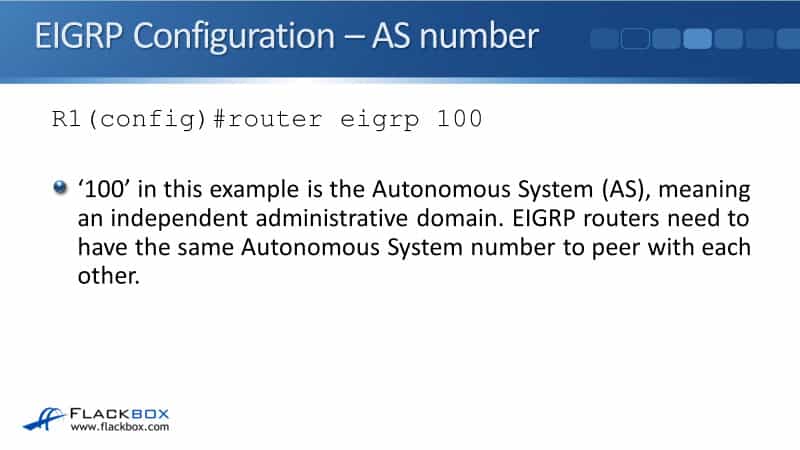 ‘100’ is the Autonomous System (AS) number which means independent administrative domain. EIGRP routers need to have the same AS number to peer with each other.