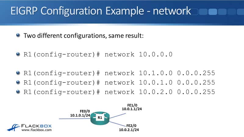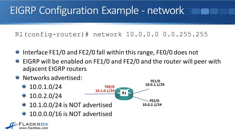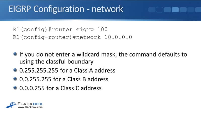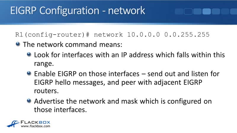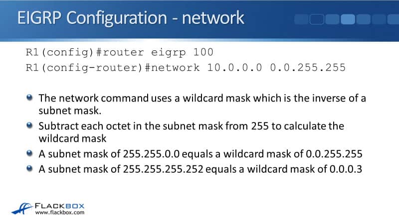 After you have enabled EIGRP globally with route-ready EIGRP and the AS number, the next command to put in is the network command. This specifies which interfaces are going to participate in EIGRP. The network command uses a wildcard mask which is the inverse of a subnet mask.