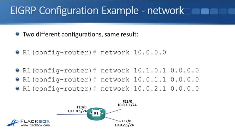 With EIGRP, we configure a network 10.0.0.0 that's a Class A address which will use our wildcard mask of 0.255.255.255. It will look for any interface that begins with 10 and it will match all three of our interfaces.
