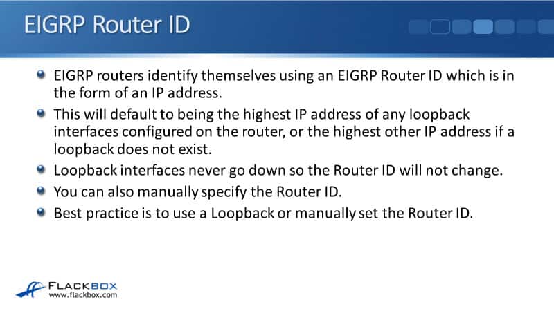 Now, you don't want the router ID to be going up and down or changing. You want it to be stable because this is how the router identifies itself to other EIGRP routers. Therefore, it's recommended to either use the lookback interface or you can manually specify a router ID. If you do either of those, then the IP address within the router ID is definitely never going to change.