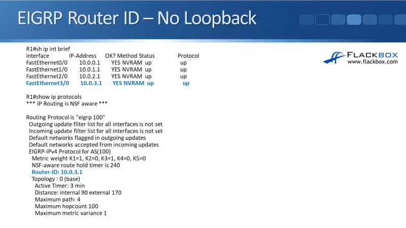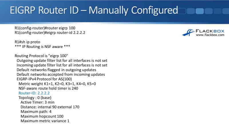 In the example here, we've said EIGRP router ID 2.2.2.2. That IP address is not actually configured on the router. However, real world best practice is to use an IP address that has been configured on the router because it gets confusing otherwise.