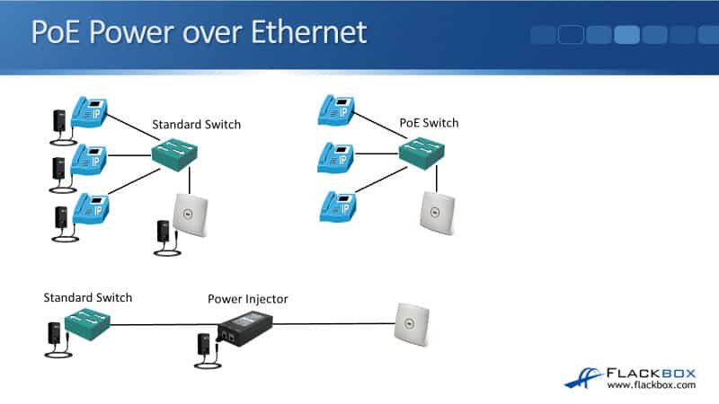 When you use a PoE switch, the power is sent down to the device over the standard network cable. So, it saves you from having to use a separate power supply for all of those different devices. When you do have an office that has got IP phones deployed in there, it is most often used that you're going to have a PoE switch there rather than standard switches.