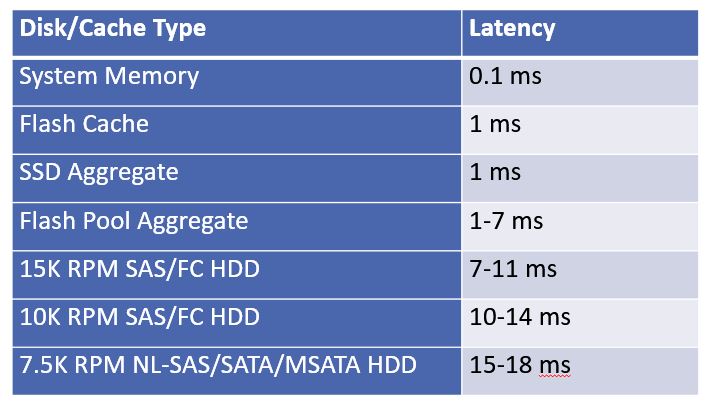 The table below shows ballpark values for read latency when a NetApp FAS system is under up to fifty percent load for an average workload. The figures are for latency within the node and do not take the network latency between the client and storage system into account.