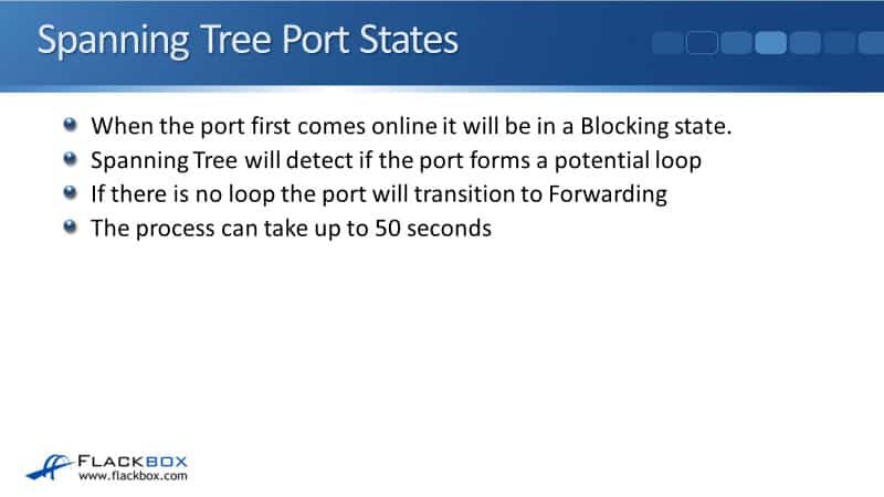 Spanning Tree will detect if the port forms a potential loop, and if there's no loop, the port will then transition to a forwarding state. The process can take up to 50 seconds if you're using traditional legacy Spanning Tree.