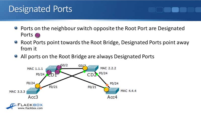 From Acc3 F0/21 to CD2 F0/21, the CD2 side is going to be the Designated Port. It's also going to be the CD2 side which is the Designated Port going on the link on F0/24 down to Acc4.