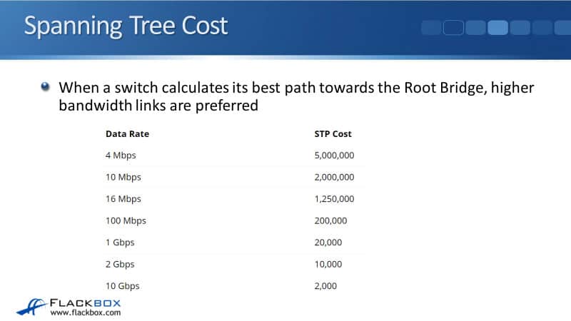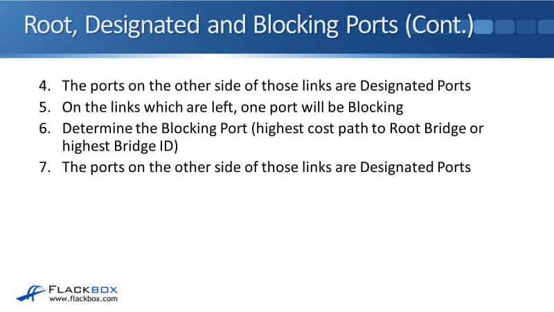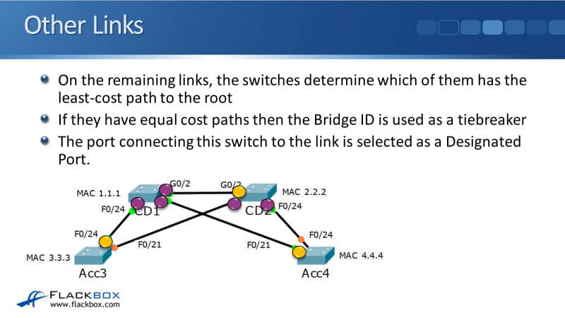 On the remaining links, the switches determine which of them has the least cost path to the Root. If they have equal cost paths, then the Bridge ID is used as a tie-breaker. The port connecting this switch to the link is selected as a Designated Port.