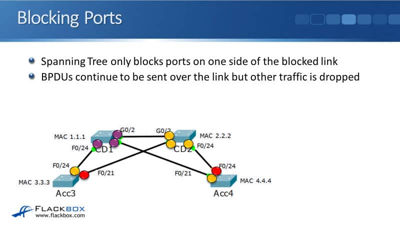 Any ports which have not been selected as a Root Port or a Designated Port pair would potentially form a loop, and those are going to be selected as our Blocking Ports. In our diagram right now, we've only got two Ports left over, that's F0/21 on Acc3 and F0/24 on Acc4.