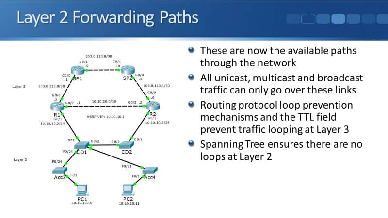 If you look up at the top paths of a network, you see that there are loops between our routers. Routing protocol loop prevention mechanisms on the TTL field in our IP header prevent traffic from looping at layer three.