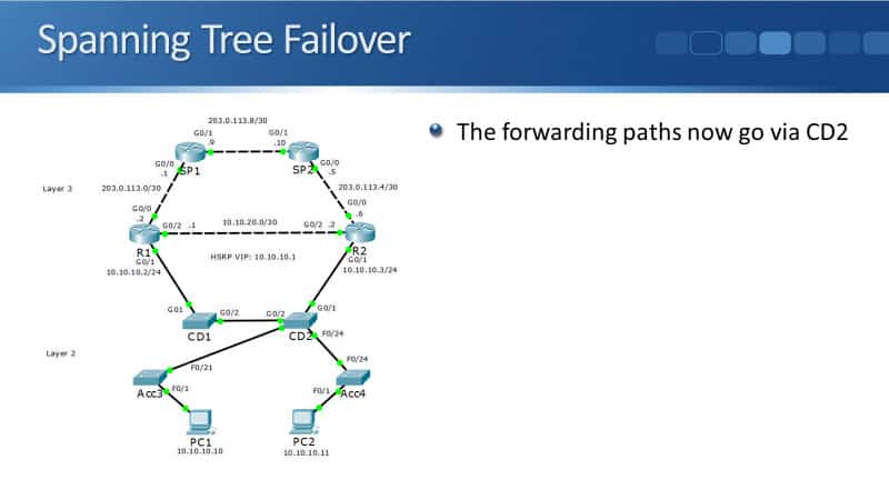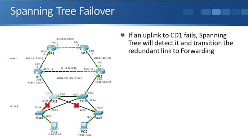 You can see in the example here that my uplink from Acc3 to CD1, and my uplink from Acc4 to the Root Bridge CD1, both failed. If that happens, Spanning Tree will detect it and it will fail it over to the next best path, still ensuring that there are loops.