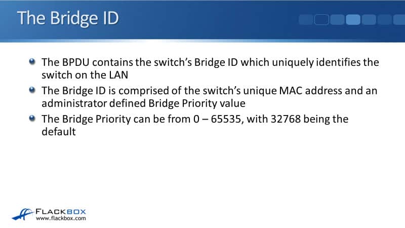 The BPDU contains the switches Bridge ID, which uniquely identifies the switch on the LAN. The Bridge ID is comprised of the switches MAC address and also an administrator defined Bridge Priority Value. The Bridge Priority can be from 0 to 65535, and 32768 is the default.