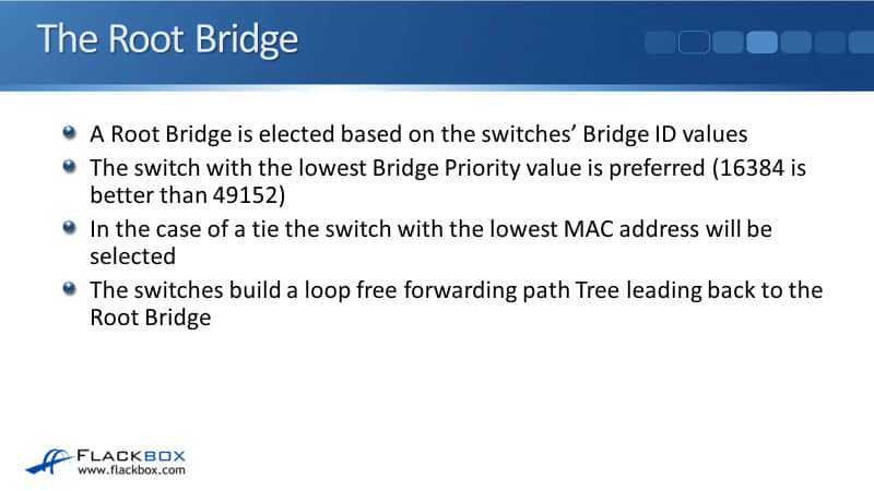 This is how the Spanning Tree operations work. The first thing that happens is a Root Bridge is elected, so all the switches come online and they send BPTU's to each other over the LAN. They all detect each other and whichever Bridge has got the best Bridge ID becomes the Root Bridge.