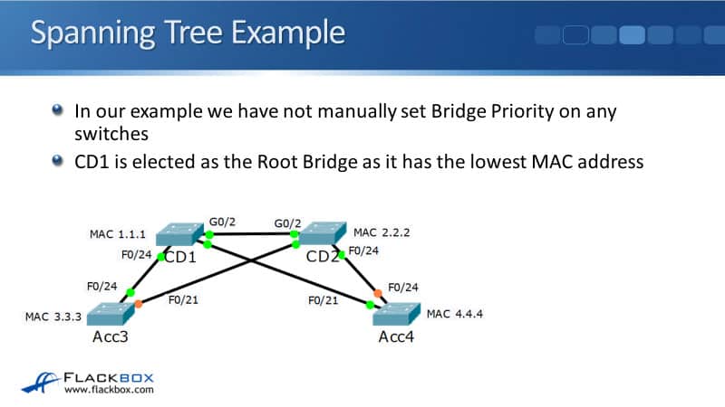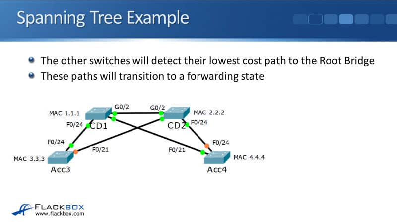 I haven't set a Bridge Priority on any of the switches, therefore, CD1 will be elected as the Root Bridge because it has the numerically lowest MAC address. The other switches will then detect the lowest cost path to get to the Root Bridge and those paths will transition to a forwarding state.