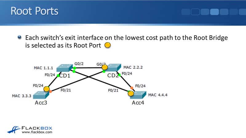 Finally, we have Acc4 and it should be obvious again, which will be the Root Port on Acc4. It's going to be interface F0/21, which again is directly connected to the Root Bridge of CD1.