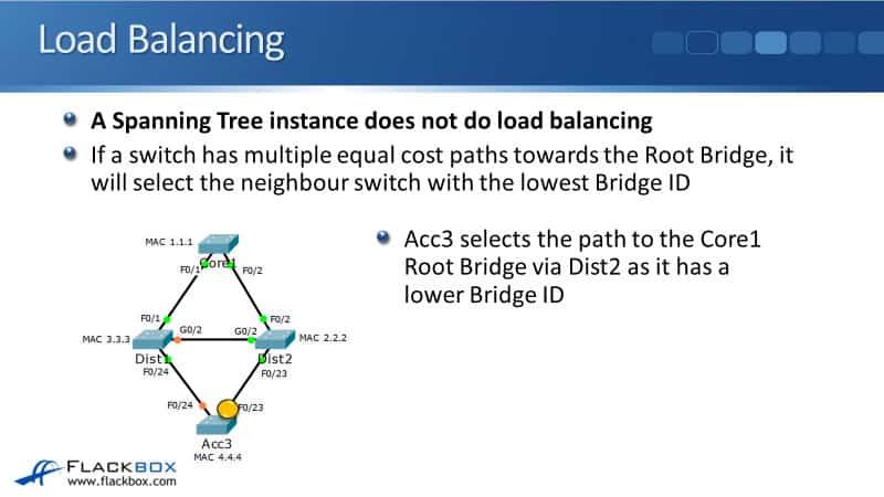 It selects the one best path. So what happens here is, Acc3 selects the path to the Core1 Root Bridge via Dist2 as it has a lower Bridge ID.