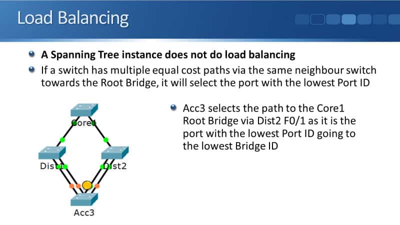 Out of those four uplinks, only one of them is going to be selected. Acc3 will select the path to the Core1 Root Bridge via Dist2 port F0/1 as it is the port with the lowest Port ID. It is going to the switch with the lowest Bridge ID.