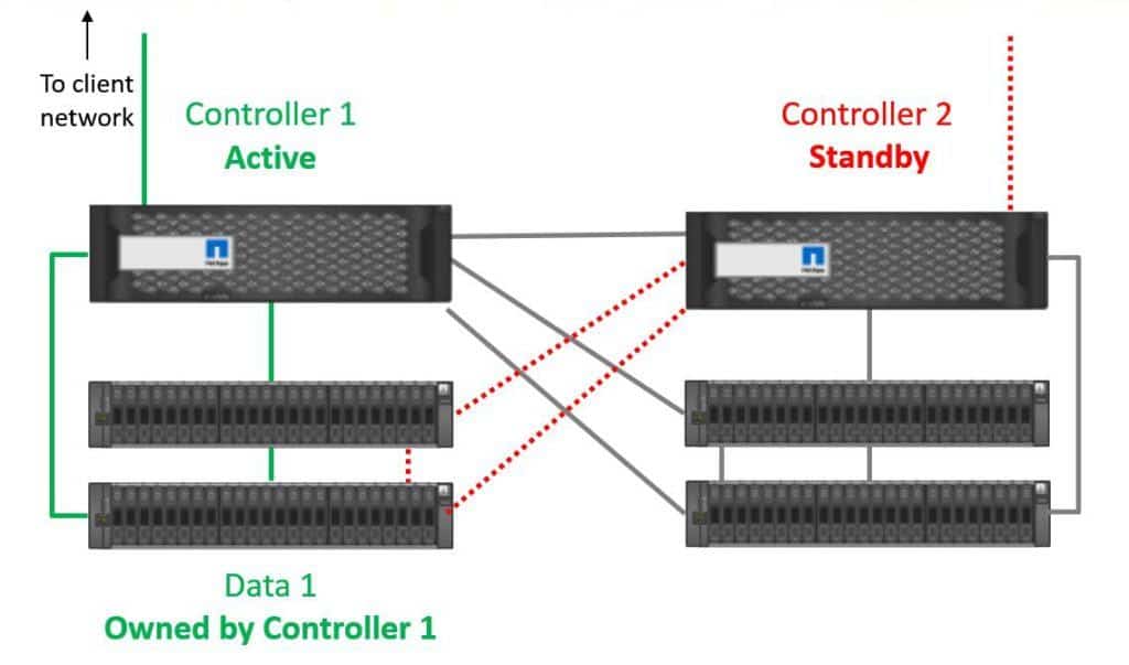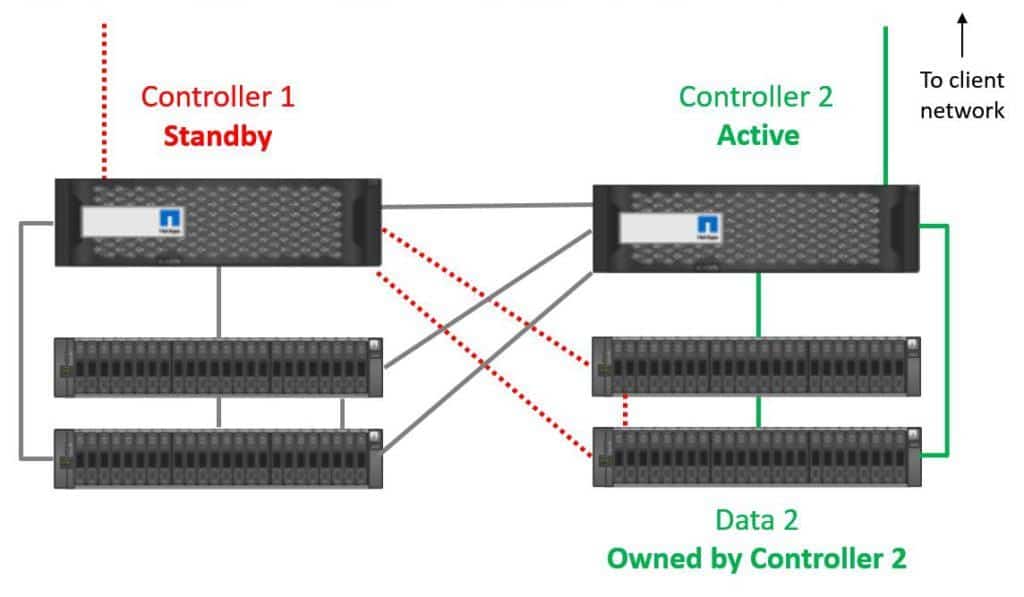 Controller 2 will stop receiving keepalives over the High Availability connection and realise that Controller 1 has gone down. Controller 2 will then take temporary ownership of Controller 1's disks. For NAS protocols, the IP address that the clients were using to access the data on Controller 1 will also fail over to Controller 2. For SAN protocols, multipath software on the clients will fail network connectivity over to Controller 2.