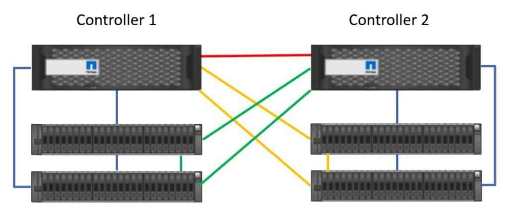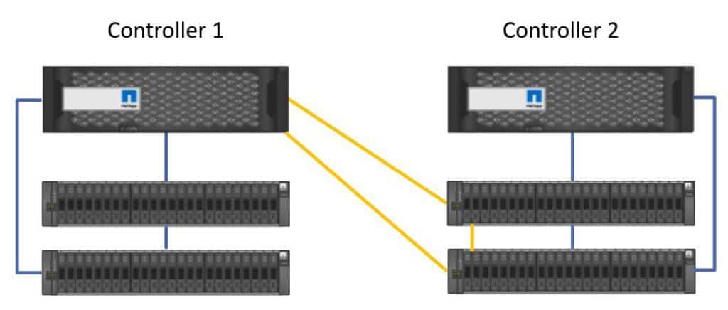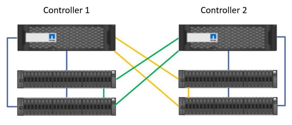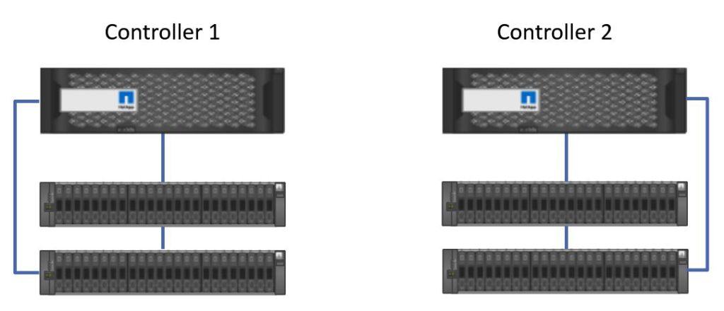 For High Availability we need to be able to serve data to clients if either controller fails, so we connect the controllers to each other’s shelves. The cabling is done in the same way again.