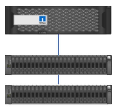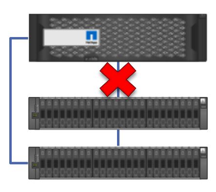The controller is not connected to every individual shelf as that would require an unreasonable number of ports on the controller. A SAS port in the controller is cabled to the top shelf in the stack, and we then daisy chain cables from disk shelf to disk shelf all the way down to the bottom shelf in the stack.