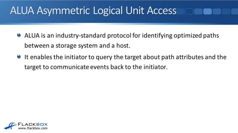 ALUA stands for Asymmetric logical unit access. It's an industry-standard protocol used to identify optimized paths between a storage system and a host initiator. It enables the initiator to query the target, that's your storage system, about path attributes and the target, to communicate events back to the initiator.