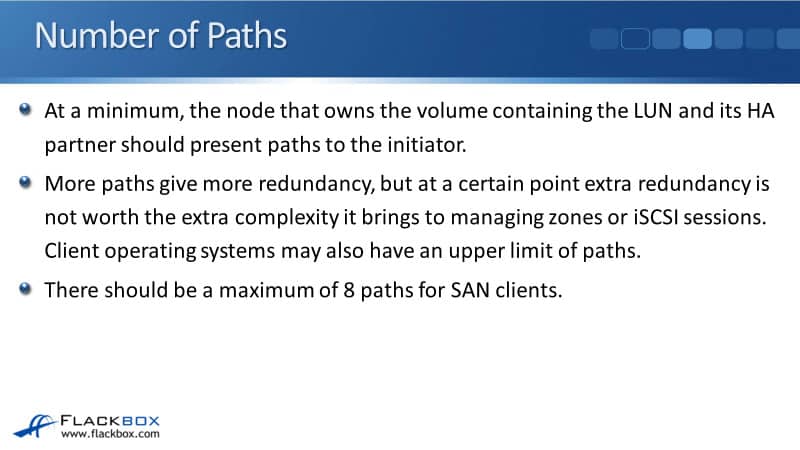 Now, let's talk about the number of paths that should be reported to the initiators. At a minimum, the node that owns the volume containing the LUN and its high availability partner should present paths to the initiator.
