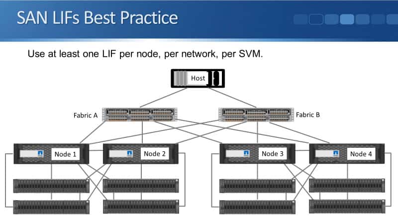 You can see in the diagram that we have four nodes. Each of the nodes is attached to Fabric A and Fabric B. Therefore, it means that we would have eight LIFs, one on each of the physical ports.
