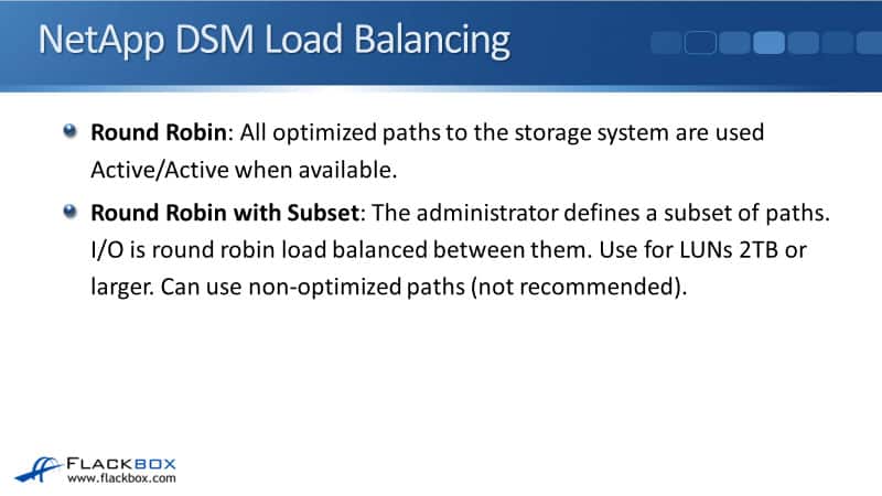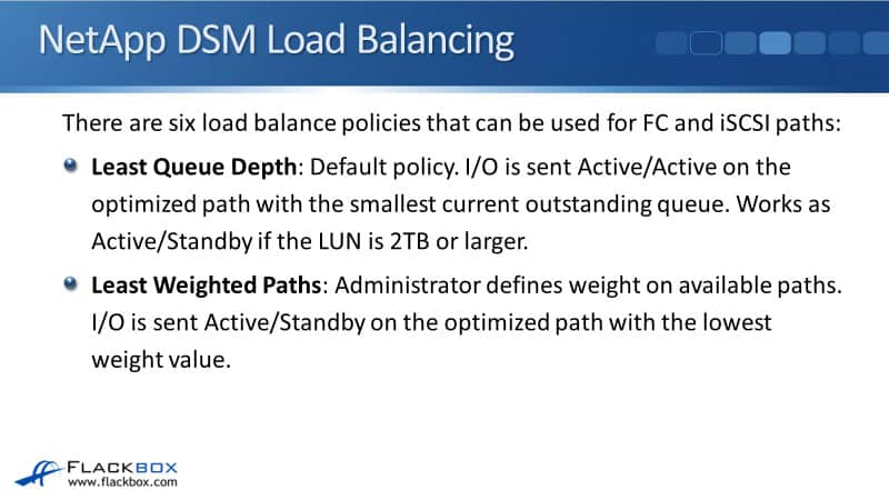 There are some different options in the host operating system. Looking at Windows, for example, and we're using the NetApp DSM. There are six load balancing policies that are available with the NetApp DSM, whether you're using fiber channel or iSCSI.