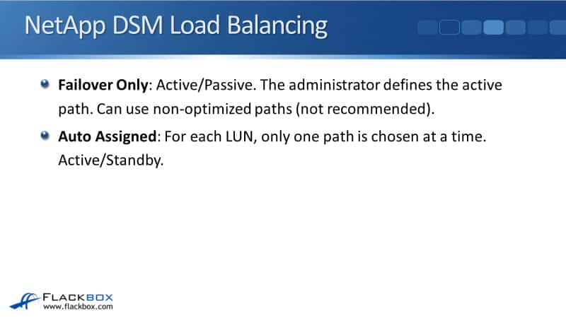 The last one is Auto Assigned. Here, for each LUN, only one path is chosen at a time. It's active/standby. Those were the available load bouncing options if you've installed the NetApp DSM on Windows.