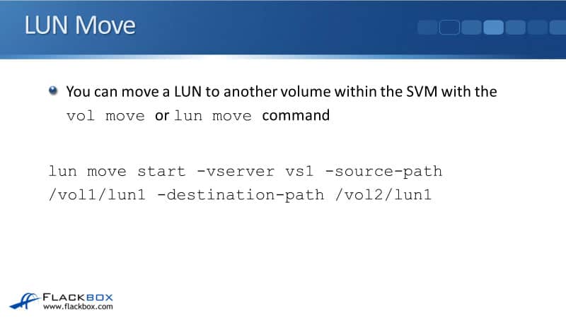 lun move start -vserver vs1 -source-path /vol1/lun1 -destination-path /vol2/lun1