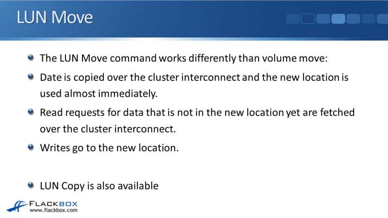 With the LUN Move, the data is copied over the cluster interconnect. That's the same as with the volume move. But with the LUN Move, the new location is used almost immediately. It doesn't wait for all the data to move and then do a cutover.
