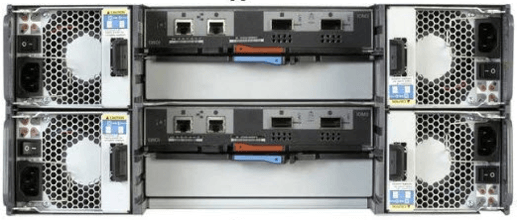 Looking at the back of a DS2246, we’ve got redundant power supplies down at the bottom and our IO Modules at the top. The IO module has two Ethernet ports for the Alternate Control Path (ACP) connection and two SAS ports. We have two IO modules to give us connectivity to both controllers for high availability.