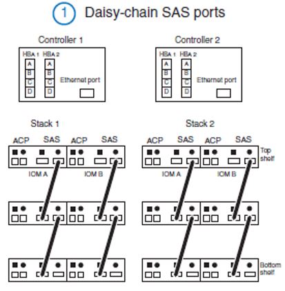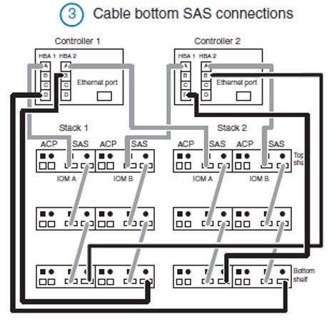 The example below is for a high availability pair of two controllers, with two quad-port SAS HBAs and two stacks of disk shelves. When we do the cabling it’s split up into different stages to simplify it.