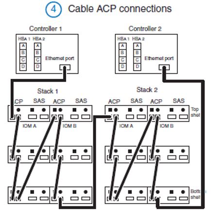 As well as being connected with SAS cables to SAS ports on the controller, the disk shelves are connected with Ethernet cables for an Alternate Control Path (ACP). ACP provides separate paths for the data plane (the actual data being written to and read from the disks) and the control plane (control messages from the controller to the shelf). This provides additional stability and troubleshooting capabilities. ACP is optional (the SAS cables can be used for both control and data plane traffic) but highly recommended.