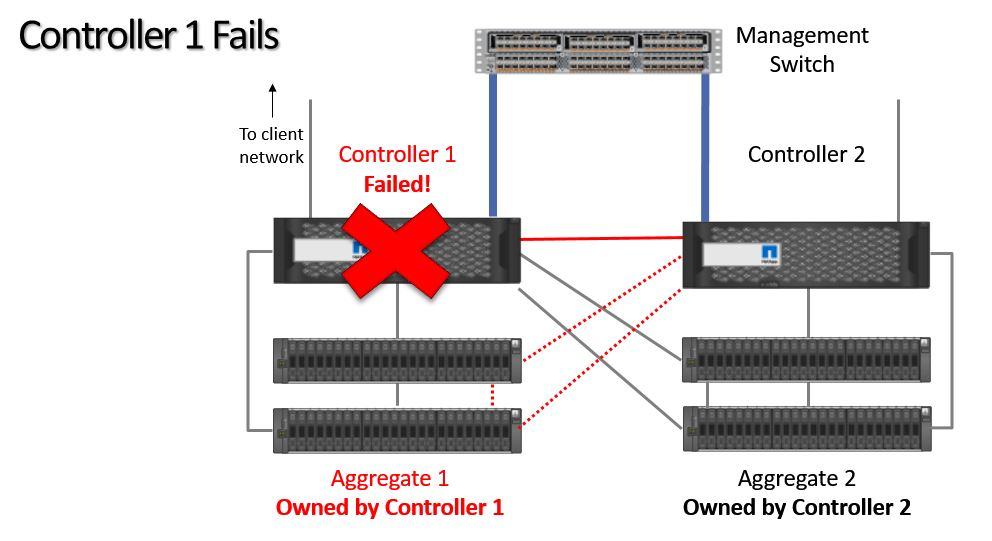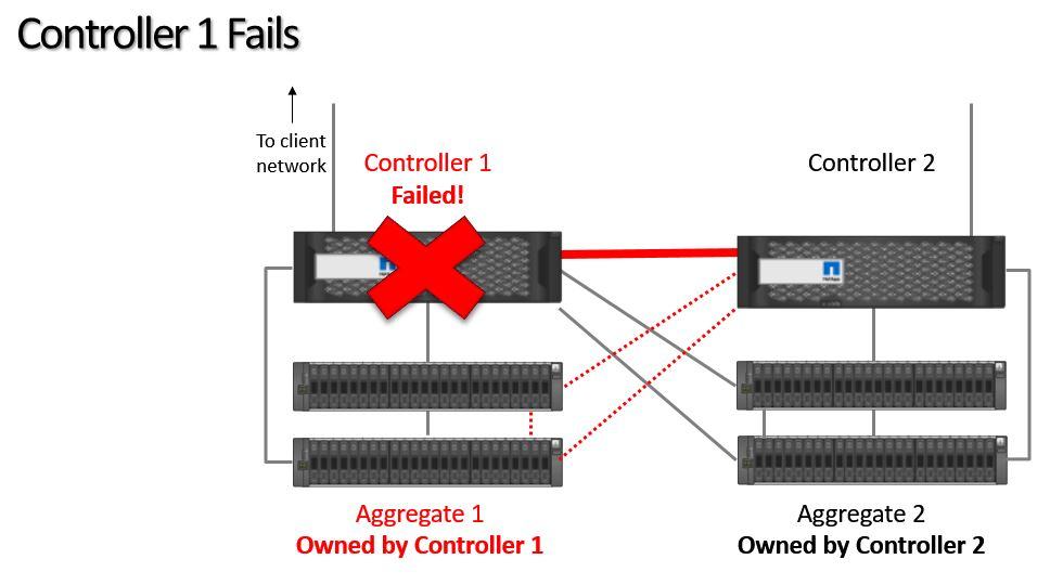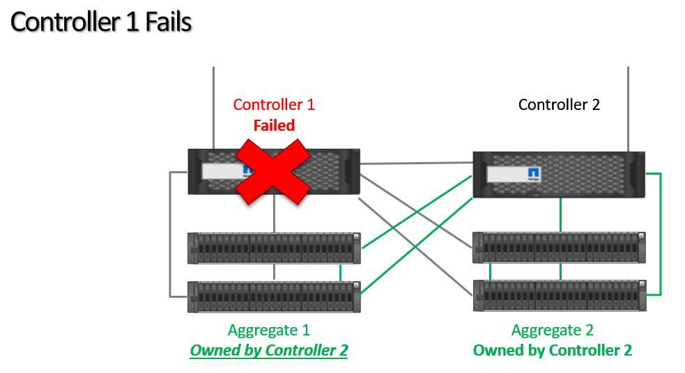 If Controller 1 fails, then Controller 2 will take temporary ownership of its aggregates.